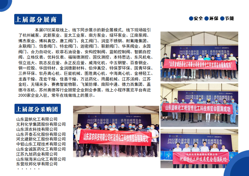 展览范围涵盖泵阀机电设备、仪器仪表自动化、化工技术装备、安全防爆设备、制冷及换热处理设备、废水废气环保治理技术、包装与储运装备、化工类产品八大板块。重点邀请了包括石油、化工、氯碱、化肥、医药、生物发酵、食品、造纸、制糖、钢铁、电解铝、焦化、轮胎、水利、供热、电力、电子、冶金、陶瓷、印染、建材、消防、农业灌溉、工矿井排水、环保等行业人士到会参观,3天接待专业观众达7万余人次,较去年增长了22%。据统计,现场意向成交额10亿元!2023年我们再次诚邀行业精英汇聚淄博,合作交流!